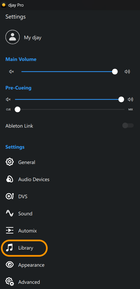 - Open the djay app, click on the Algoriddim logo at the top of the screen, and then select Settings from the main menu.