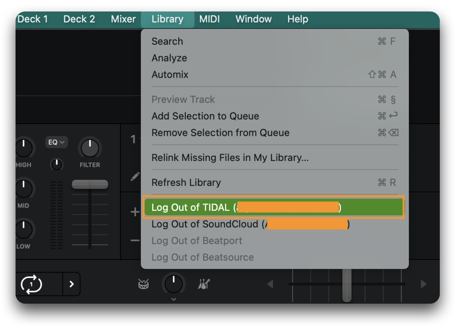 Select "Library" from the main menu bar at the top of the screen, then select "Log Out of [Streaming Service]" — in this example, "Log Out of TIDAL."