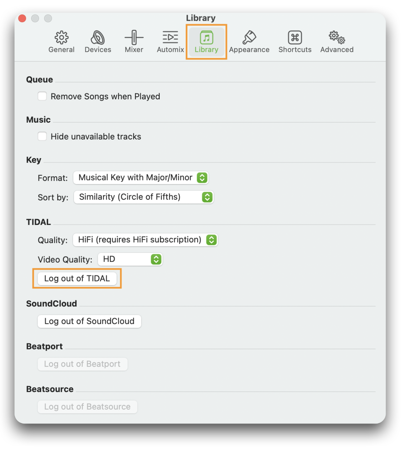 - Make sure the "Library" tab is selected, then select "Log out of [Streaming Service]" — in this example, "Log out of TIDAL."