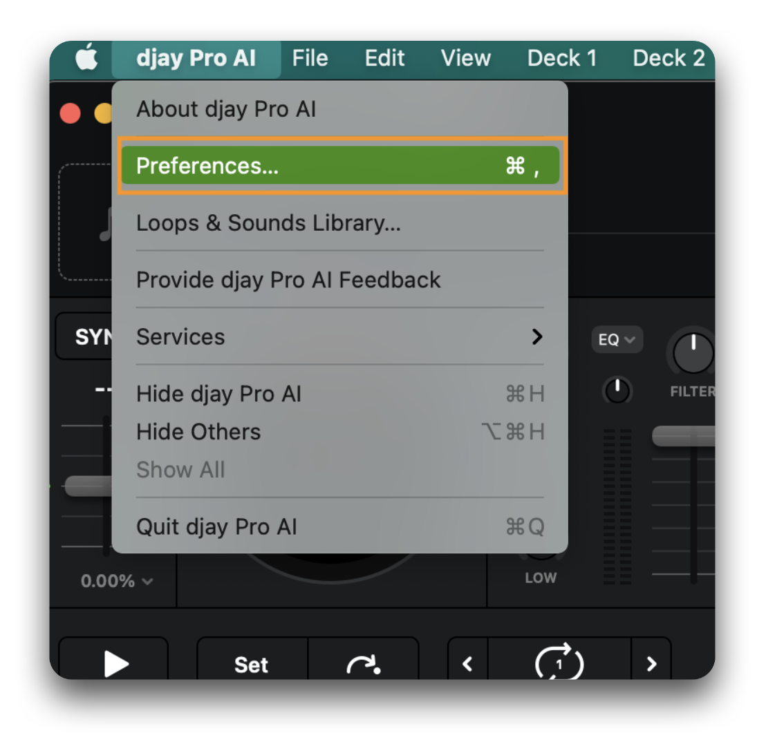 - Open djay's Preferences by selecting "djay Pro" from the main menu bar, then select "Preferences...".