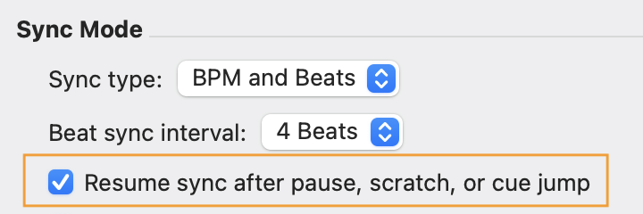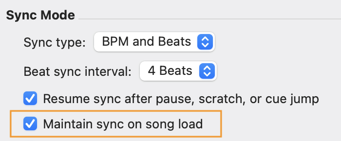 - Use Maintain on song load or Turn off on pause/scratch/cue jump to control when sync remains active.