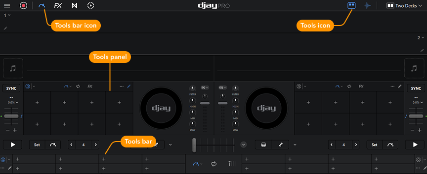 To access cue points, open the Tools Bar or Tools from the main toolbar. The Tools Bar provides a compact, always-visible set of controls, while the Tools view offers a larger, more detailed layout.