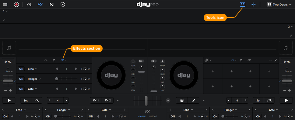 Access up to three effects per deck and change them by clicking the effect name. Use the controls next to each effect to turn them on/off, adjust the dry/wet mix, and control effect intensity.