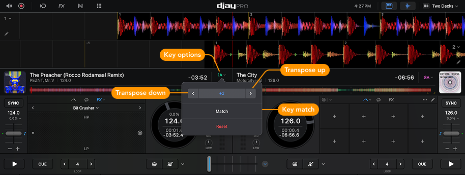 Use the Key options menu to match or change the key of your tracks. You can automatically match the key of two tracks using Key Match, or manually transpose the key up or down in semitone steps.