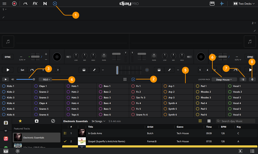 Looper grid: Displays loops in columns, with each column representing a different element—such as kick drums, hi-hats, vocals, and more.